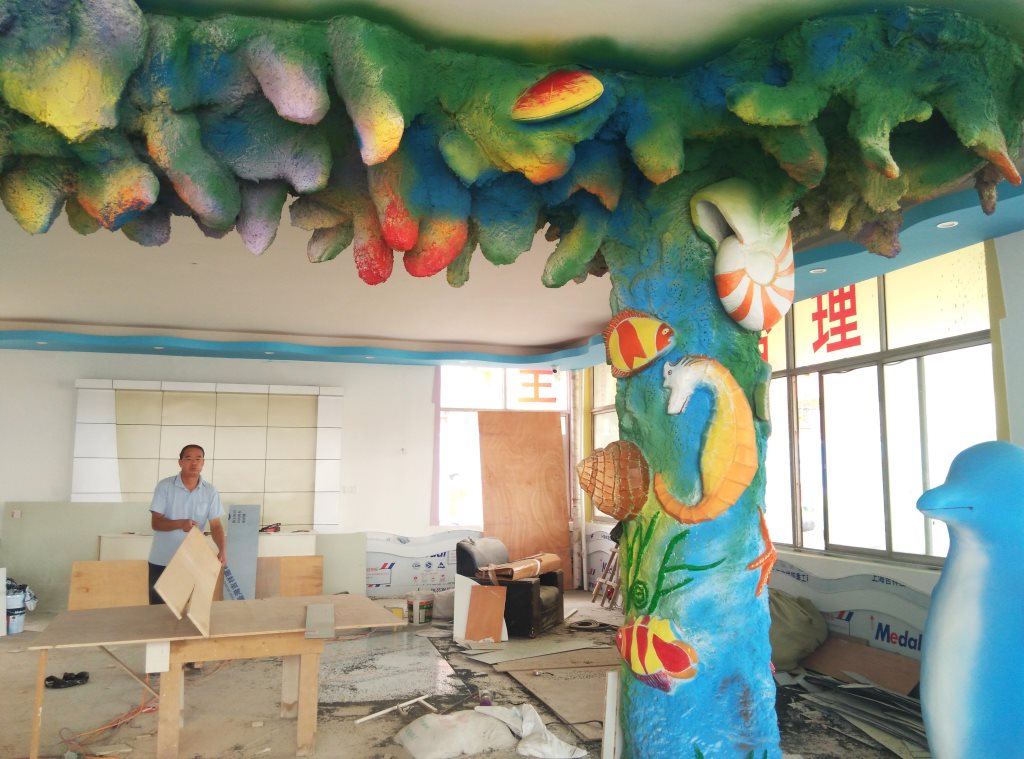 施工內容:幼兒園室內假樹、水泥假山大門、室內房頂星空、水泥蘑菇亭、水泥小鹿雕塑、水泥仿真海底世界雕塑。